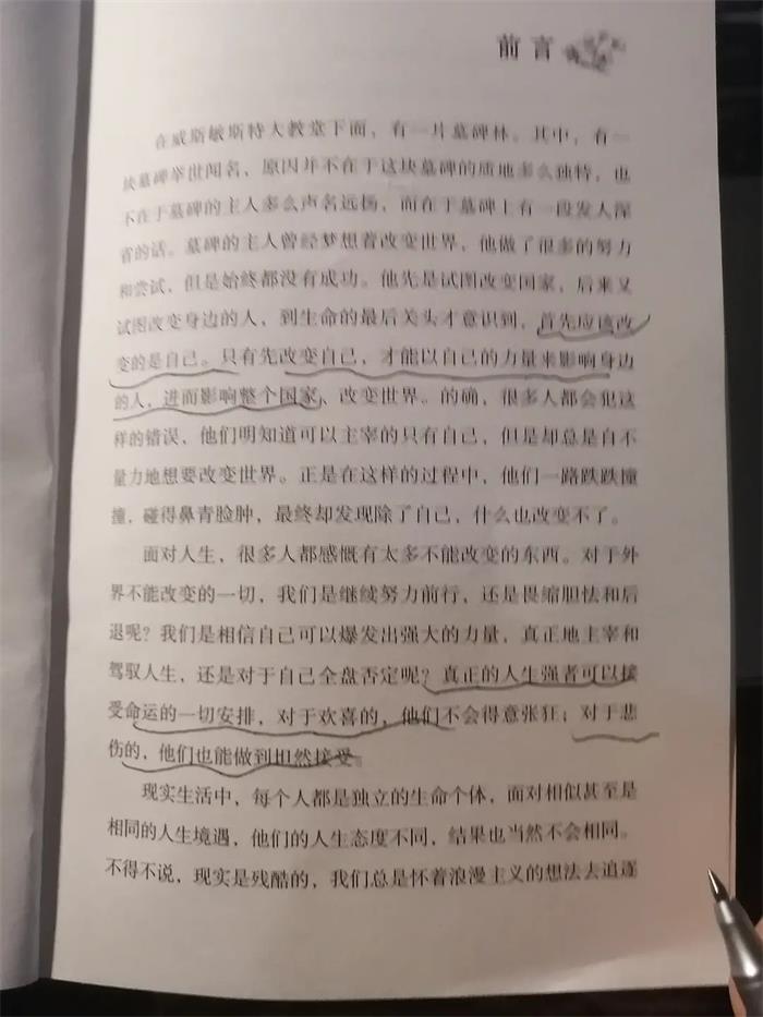 书中最令我触动的一句话便是:只有先改变自己,才能以自己的力量来影响身边的人,进而影响整个国家,改变世界。是的,我们能改变的不多,能做的便是只有改变自己。