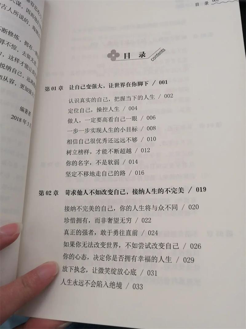 这本书在封面有一句话“让自己变强大,让世界在你脚下”乍一看好像有点成功学的味道。但内容却是从当代社会人的自信心和精神世界写的。可说它是心灵鸡汤又好像太片面了,因为它确实也切中了我性格中的一些点。