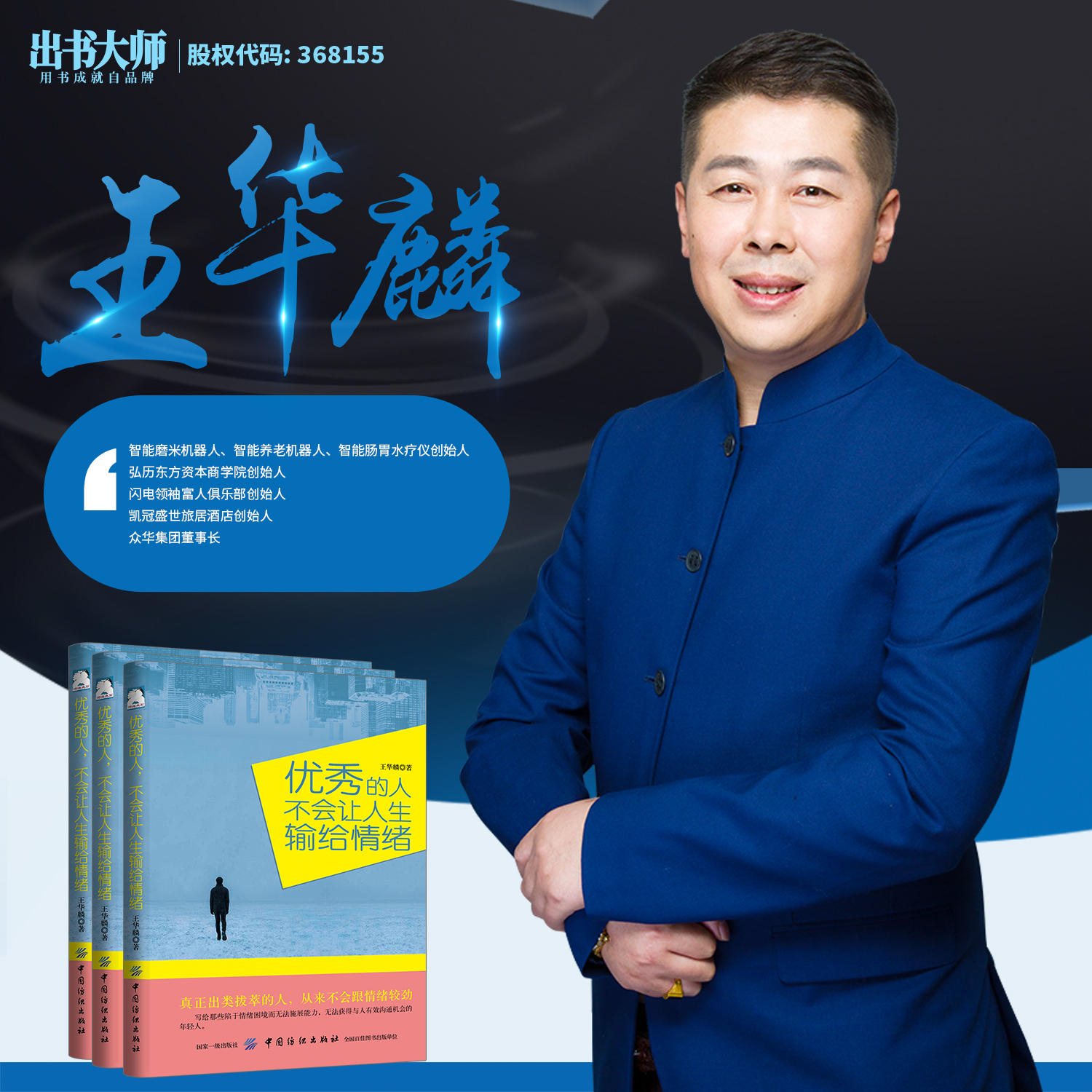 王华麟先生是“中国创新创业领军人物”,曾被授予“界诚”中国商信领袖”称号。在担任众华集团董事长的同时完成了中央财经大学金融系研究生在读学业,先后创办弘历东方资本商学院、凯冠盛世旅居酒店、闪电领袖富人俱乐部,同时进攻智能科技行业,并先后完成智能磨米机器人、智能养老机器人、智能肠胃水疗仪的创办和市场经营,成为众多品牌创始人。他尤为强调资本与方式的替换运营,曾以《生财之道财富密码》及《跨界商业模式资本大智慧》为主题,讲述如何借力、借势、借场跨越创业障碍,辨析38种跨界创新商业模式,并对金融、财务、股权、融资等多领域内容进行全方位的解读,将商业模式融于讲课之中,深入浅出的方式讲解创业过程中的难与易。日前,王华麟先生与出书大师网展开合作,由出书大师网全权策划出版其著作《优秀的人不会让人生输给情绪》,正在全网热销,该书将王华麟先生丰富的人生经验和人生阅历表现得淋漓尽致,对情绪管理、情绪驾驭、情绪疏导等方面进行了详细的叙述。