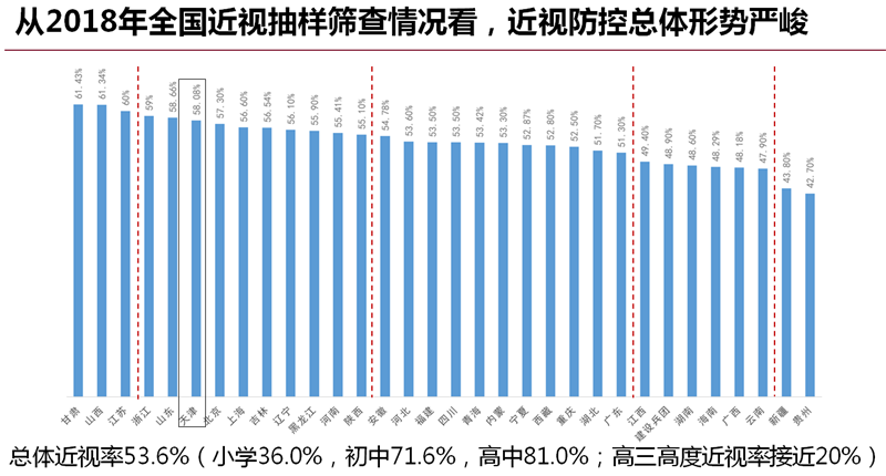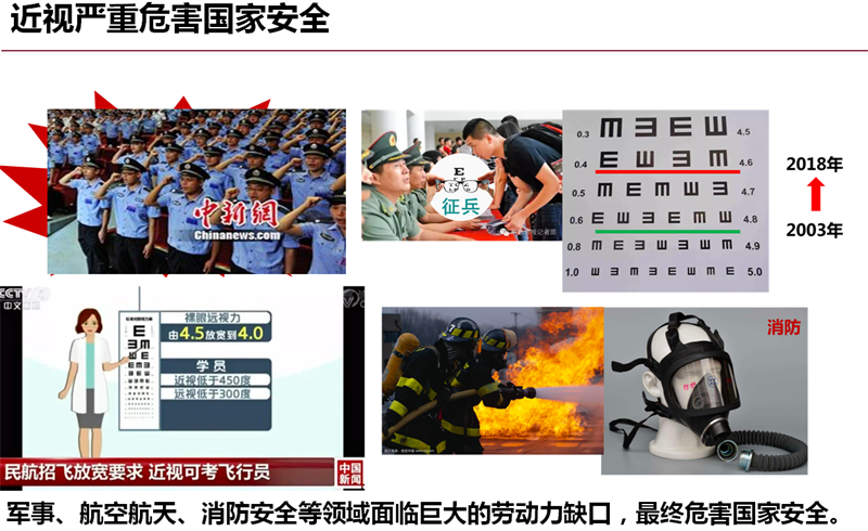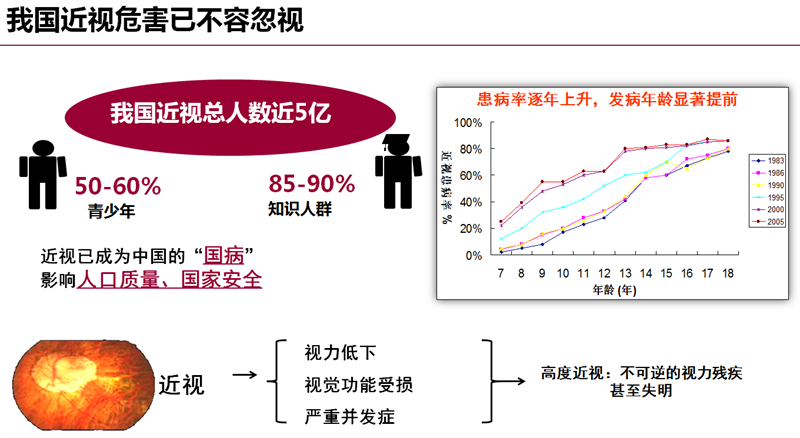据2016年发布的我国首份系统研究视觉健康的白皮书《国民视觉健康》显示,我国5岁以上人群中,每3个人就有1个人是近视。如果不能采取有效的政策干预,预计5年左右,我国5岁以上人口的近视发病率将增长到50.86%至51.36%。白皮书同时指出,高度近视容易产生各类眼底病变,造成严重的永久性的视功能损害。近视的可遗传性和家族聚集性会影响我国未来的人口素质。目前,近视的问题在我国非常严重,严重到什么程度呢? 北京大学教授李玲于2015年发布的《国民健康视觉报告》中提到:近视不仅对生活带来不便,甚至影响到了收入水平。处于劳动年龄阶段的中度视力缺陷患者,年劳动收入比视觉健康的人群要低3796元,这一收入差距相当于城镇居民家庭人均可支配收入的1/10、农村居民家庭人均收入的1/3。这一人群的劳动收入损失总计约3909亿元。2012年各类视力缺陷导致的社会经济成本高达5600亿元左右,占GDP的比例高达1.1%左右。同时,青少年近视率高导致未来在航空航天、精密制造、军事等行业领域,符合视力要求的劳动力可能面临巨大缺口,将直接威胁我国经济社会可持续发展以及国家安全,近年来征兵、消防员、民航飞行员等的视力标准要求都在逐年降低。