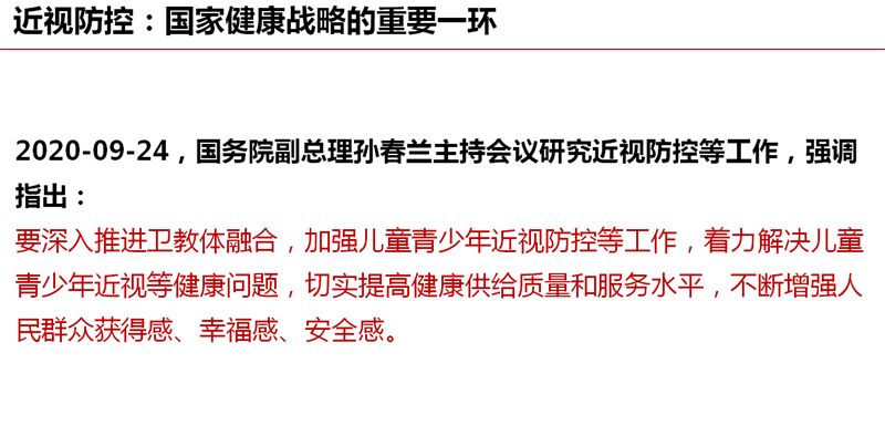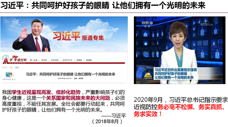近视防控已经不只是一个社会公共卫生问题,它是体现国家意志、关系国家未来的政治问题;是事关民族复兴和国家前途,影响中华民族可持续发展的命运问题;是关系民族体质健康、关系国家人才培养质量的危机问题;是关系人民群众对美好生活向往和追求的民心问题!做好近视防控工作,是国家和民族的呼唤!