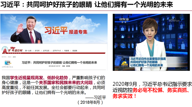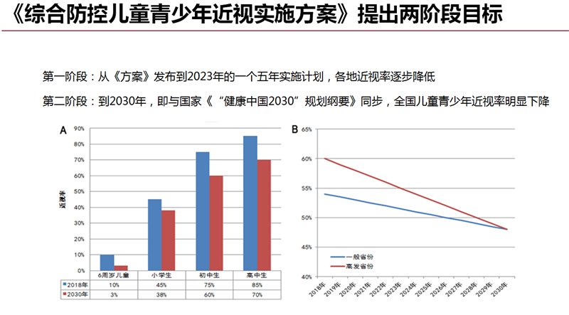 陈楠华:国家已经升级为由九部委齐抓共管,在共同制定的《综合青少年儿童近视防控实施方案》明确提出,到2023年,力争实现全国儿童青少年总体近视率在2018年的基础上每年降低0.5个百分点以上,近视高发省份每年降低1个百分点以上。到2030年,实现全国儿童青少年新发近视率明显下降,儿童青少年视力健康整体水平显著提升,6岁儿童近视率控制在3%左右,小学生近视率下降到38%以下,初中生近视率下降到60%以下,高中阶段学生近视率下降到70%以下,国家学生体质健康标准达标优秀率达25%以上。同时将儿童青少年近视防控工作、总体近视率和体质健康状况纳入政府绩效考核;将视力健康纳入素质教育;将儿童青少年身心健康、课业负担等纳入国家义务教育质量监测评估体系,对儿童青少年体质健康水平连续三年下降的地方政府和学校依法依规予以问责。