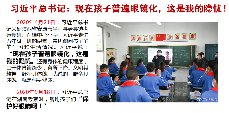 近视防控是关系人民群众新期待的民心问题,必须在中国特色社会主义进入新时代新的历史方位上,深刻认识近视防控工作的重要意义、重大责任和紧迫性;切实按照国家的要求把青少年综合防控近视工作要求落到实处。“不忘初心,牢记使命”,树牢“四个意识”,坚定“四个自信”,做到“两个维护”,聚焦“认知教育”、“筛查建档”“科技干预”。