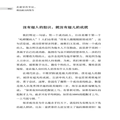 在这本书中,运用了各种名人的事例,来教会我们勇敢,在书中,作者在强调我们要拥有冒险精神和勇敢的品质的同时,也要谨慎而行,勇敢并不等于莽撞,而冒险也并不是没有方向的向前冲锋!