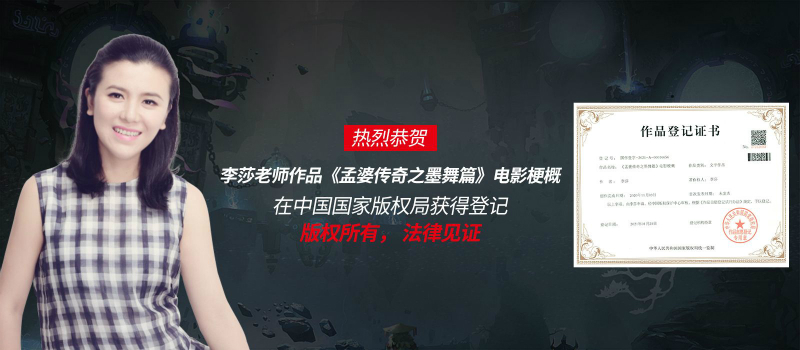 近日,李莎老师拥有版权的作品《孟婆传奇之墨舞篇》电影梗概,通过相关申请而获得了在中国国家版权局方面的著作权登记,受到版权法的保护与认可。