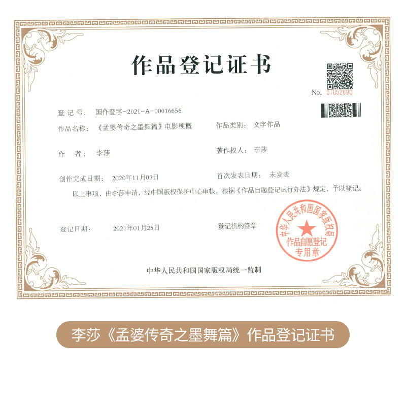作品《孟婆传奇之墨舞篇》电影梗概,成功申请版权保护并在中国国家版权局获得登记,同时获得了证书号为“国作登字-2021-A-00016656”的版权保护证书,是李莎老师所在的希达文化对文字作品《孟婆传奇之墨舞篇》电影梗概的版权重视和相关法律意识得到提升的见证。