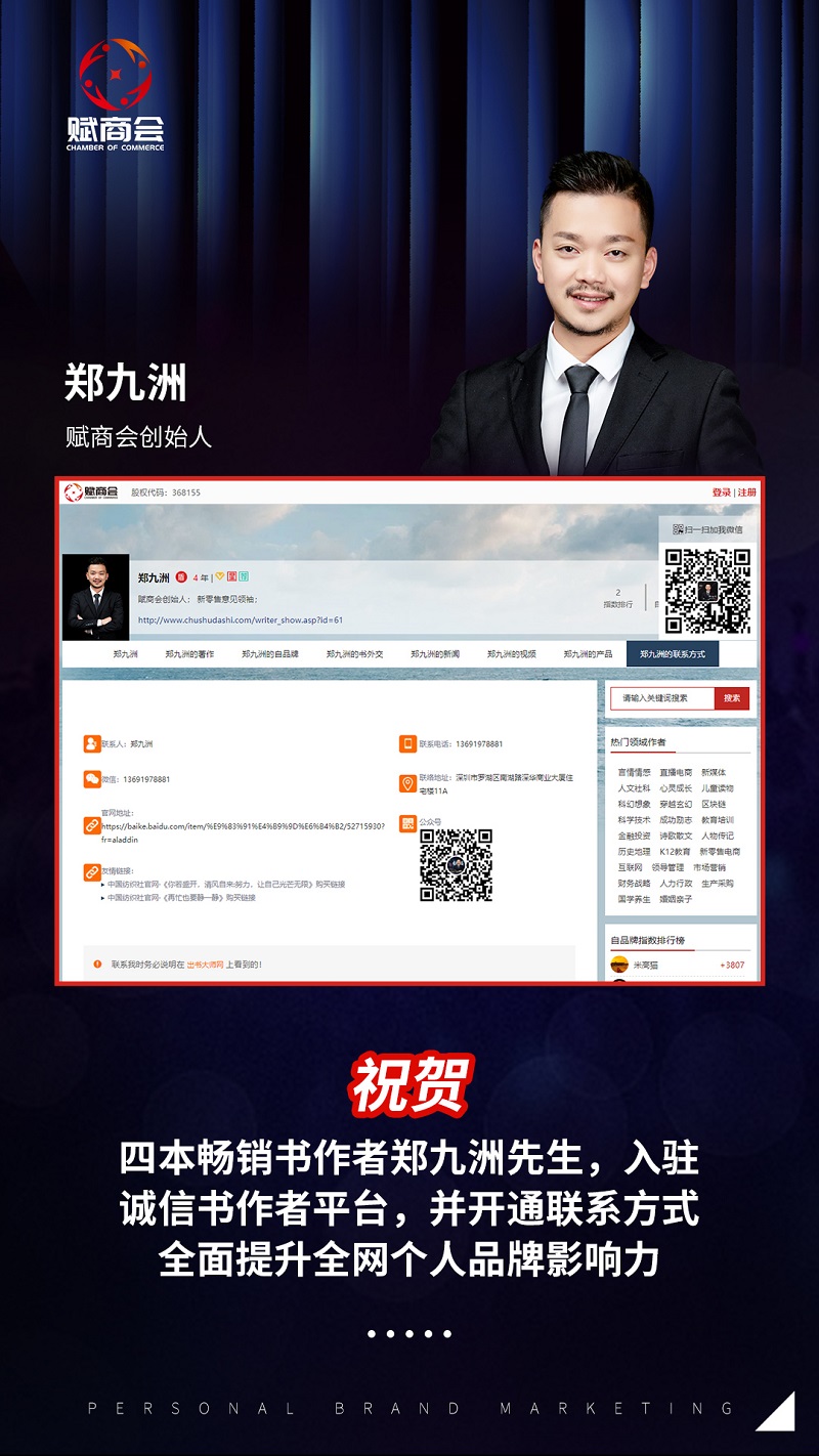 近日,赋商会创始人郑九洲老师,正式入驻出书大师诚信书作者平台,同时公开联系方式,以全面提升郑九洲老师的个人品牌价值影响力。