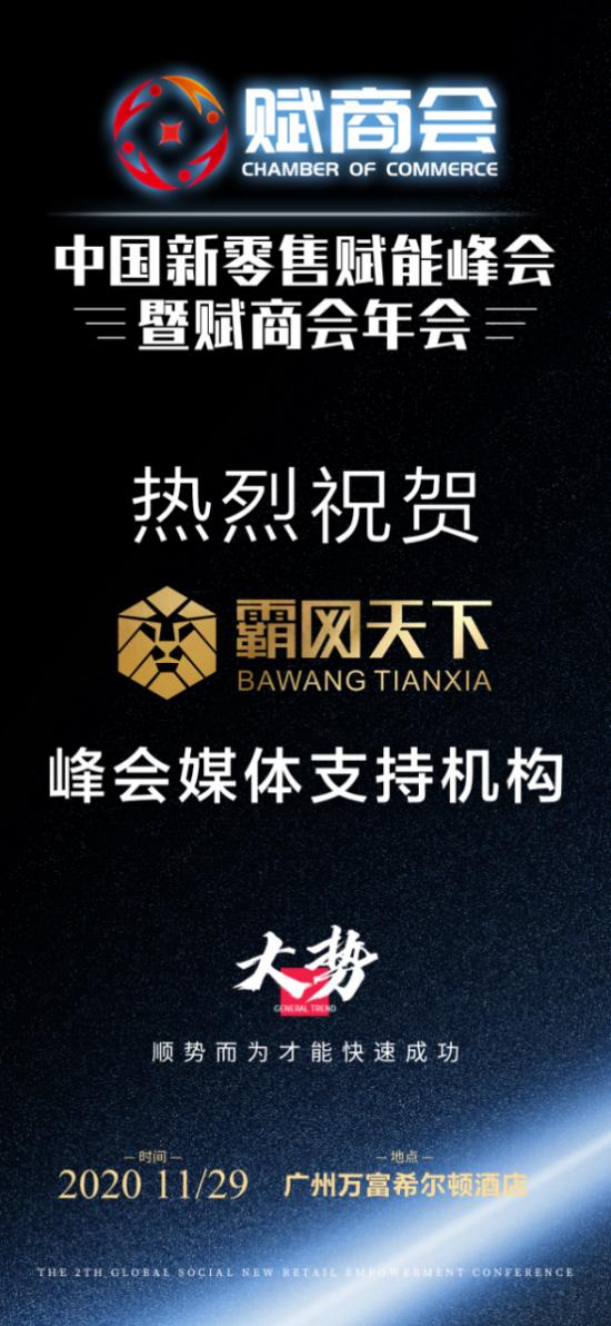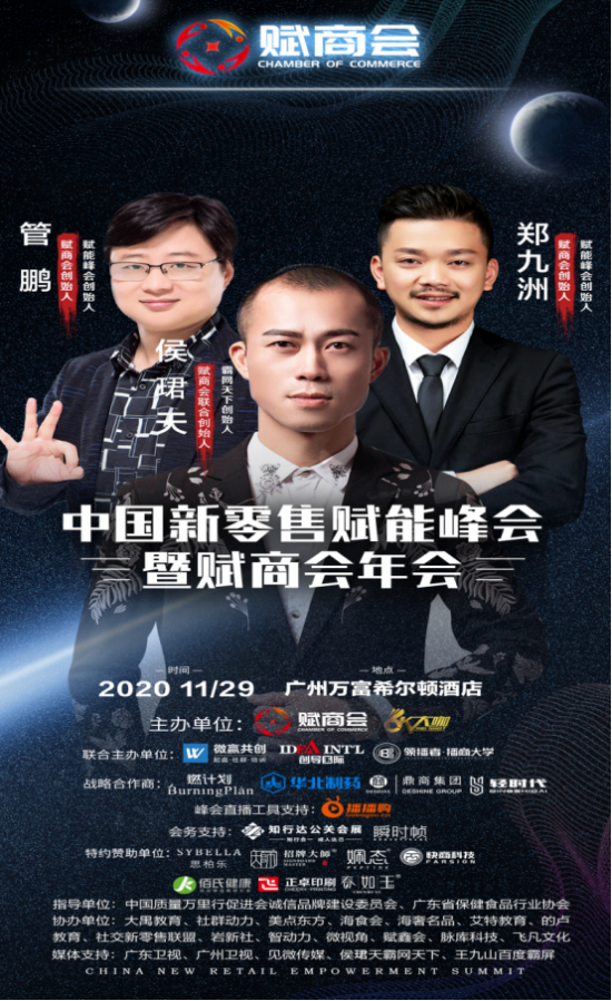 11月16日消息,由侯珺天‘霸网天下’全网媒体支持的‘中国新零售赋能峰会暨赋商会年会’将于11月29日正式亮相广州万富希尔顿酒店,本次大会由赋商会主办,400+家新零售行业品牌方、资源方共同参与。同时这也将是2020年立足广州最后一场行业盛会。由新零售行业意见领袖、赋商会创始人郑九洲亲自办会,引发行业高度关注,此次中国新零售赋能峰会暨赋商会年会主办方:赋商会、K大咖,。联合主办方:微赢共创、创导国际、播商大学,战略合作商:燃计划、华北制药、鼎商集团、轻时代。峰会指定直播工具:播播购。会务支持单位:知行达公观会展、瞬时帧。特约赞助单位:思柏乐、招牌大师、姵态、快商科技、佰氏健康、正卓印刷、春如玉。指导单位:中国万里行促进会诚信品牌建设委员会、广东省保健协会。协办单位:大禺教育、社群动力、美点东方、海食会、海奢名品、艾特教育、的卢教育、社交新零售联盟、岩新社、智动力、微视角、赋会、脉库科技、飞凡文化。全网媒体支持:侯珺天‘霸网天下“。