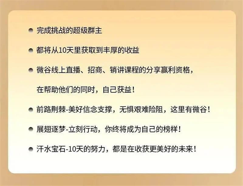 如果你是创业者,想提升自己的名气如果你从事新媒体行业,想提升粉丝粘性。加入训练营,将会有超级群主商业模式、超级工具使用详解、超级方法锁定顾客、超级直播实景演练等方式助你达成超级群主,学成下山转化财富。好了,今天我要分享的就这么多了,还希望对你有帮助。如果你需要更完整详细的社群运营实操技巧,就注关微同名注公众信号:微谷国际!查看