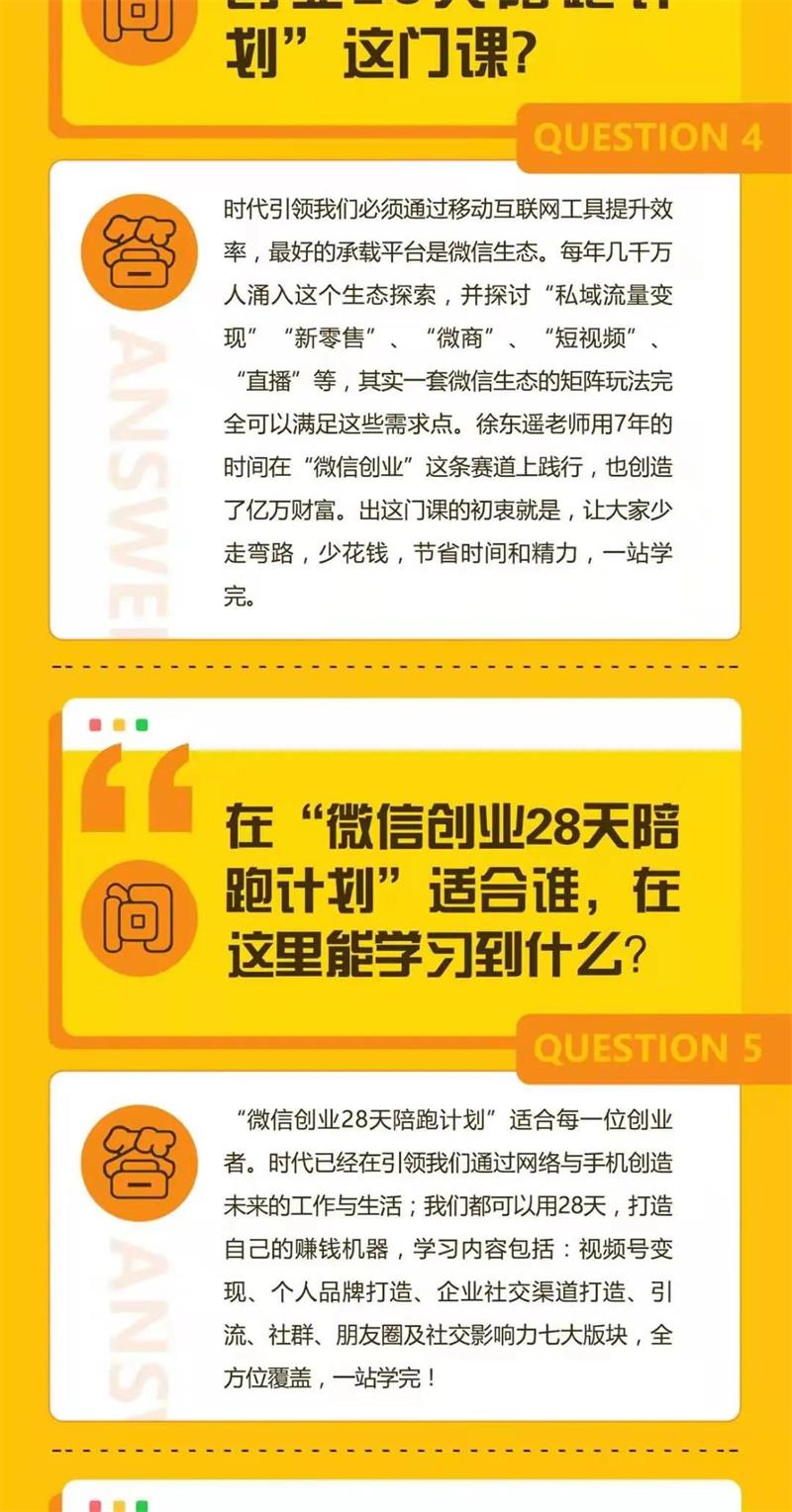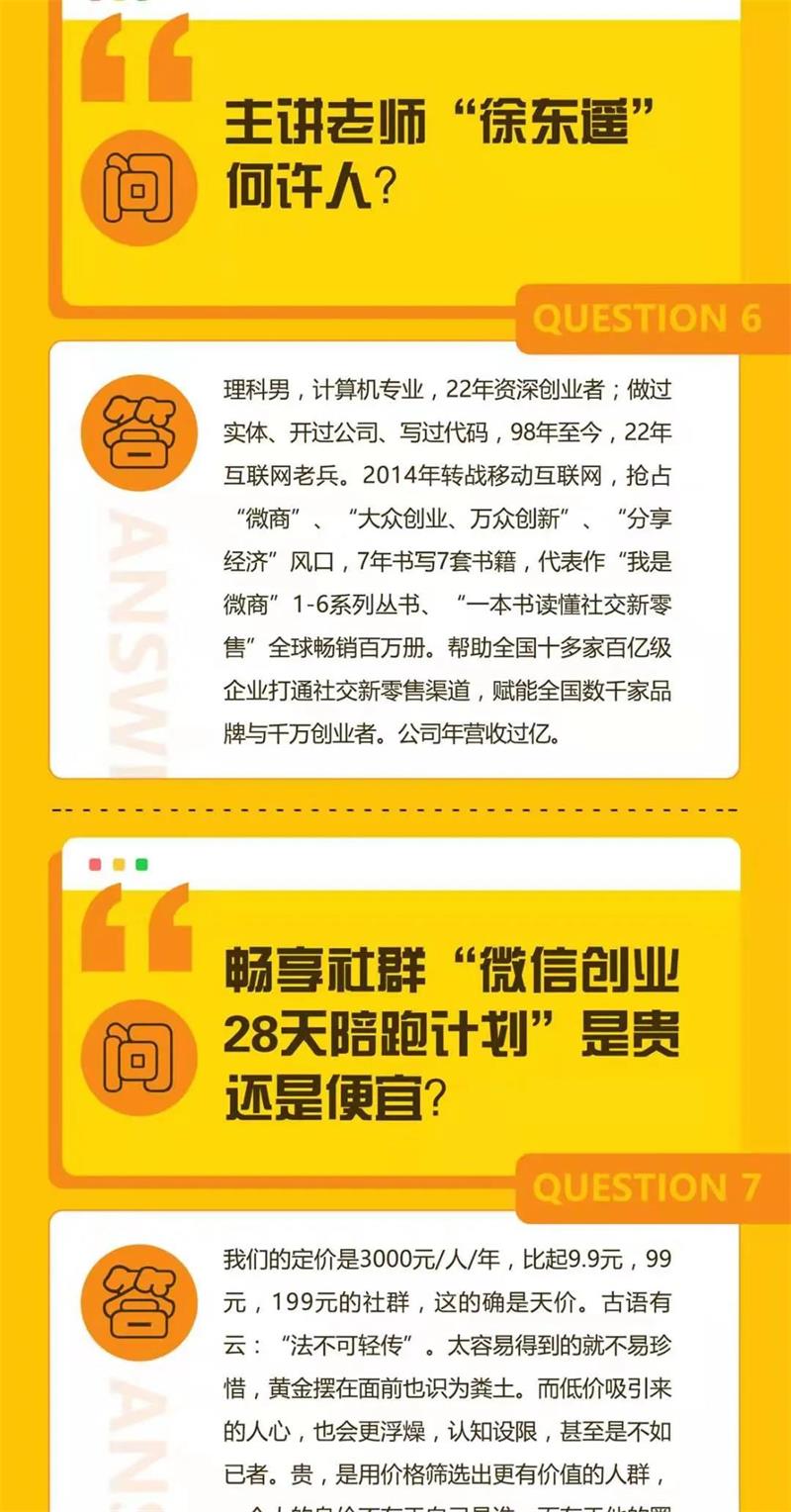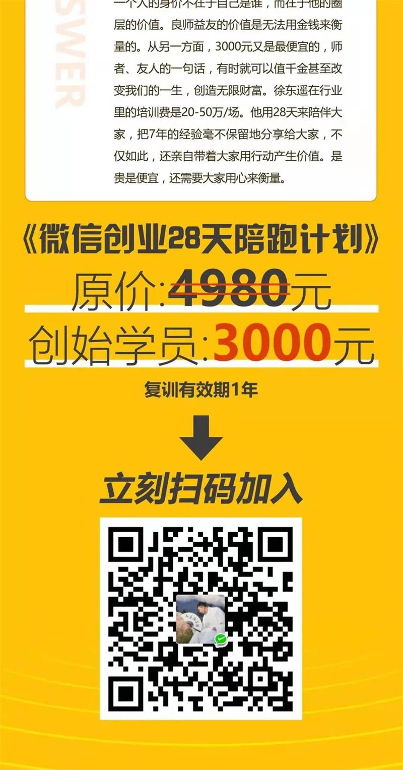 经过7年的沉淀,6个月的打磨,我研发出这套《微信创业28天陪跑计划》,把我过去7年的经验全部装进这28天的训练计划中。很多人问我,为什么你做事如此简单,我会说,化繁为简,我的7年,学习、成长、失败、收获,走了很多弯路,我知道哪里行得通,哪里行不通,才会有今天的《微信创业28天陪跑计划》。