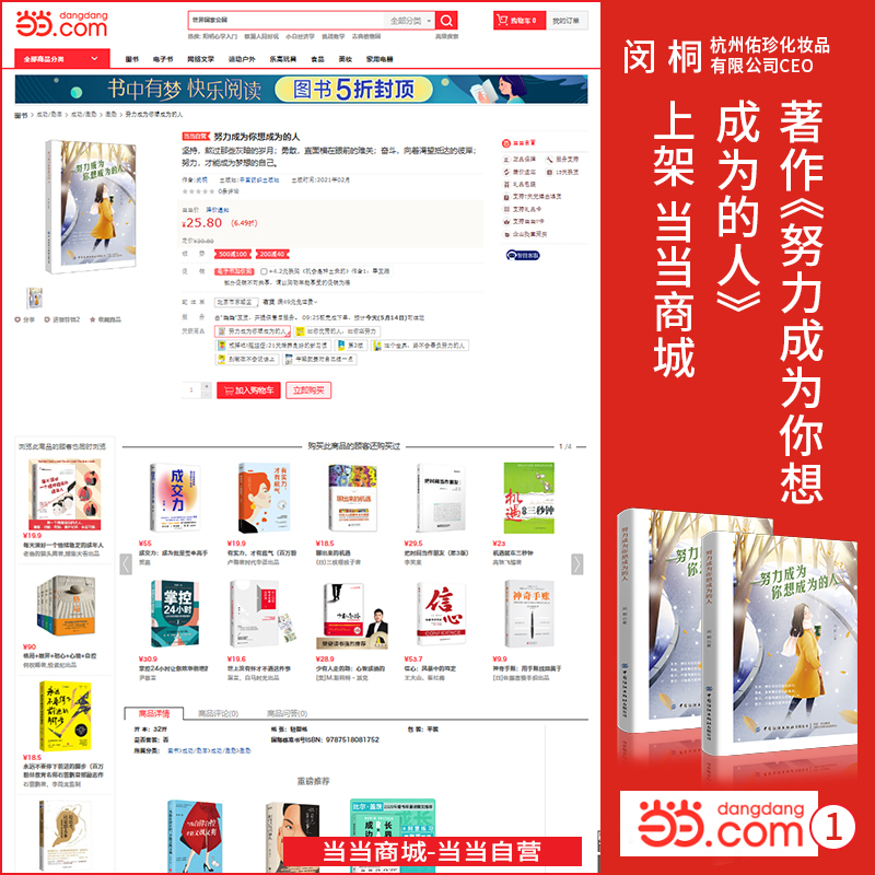 近日,由中国纺织出版社出版、出书大师网全权出版策划、香港佑珍国际CEO闵桐老师创作的著作《努力成为你想成为的人》正式上架京东等各大图书销售平台,与广大读者朋友们见面,从而开启了火爆热销序幕。