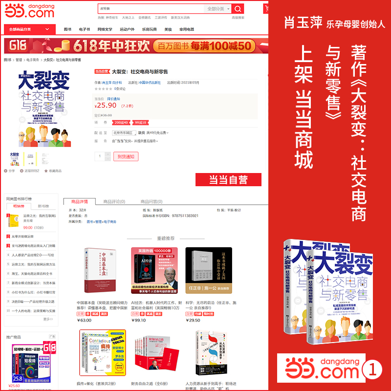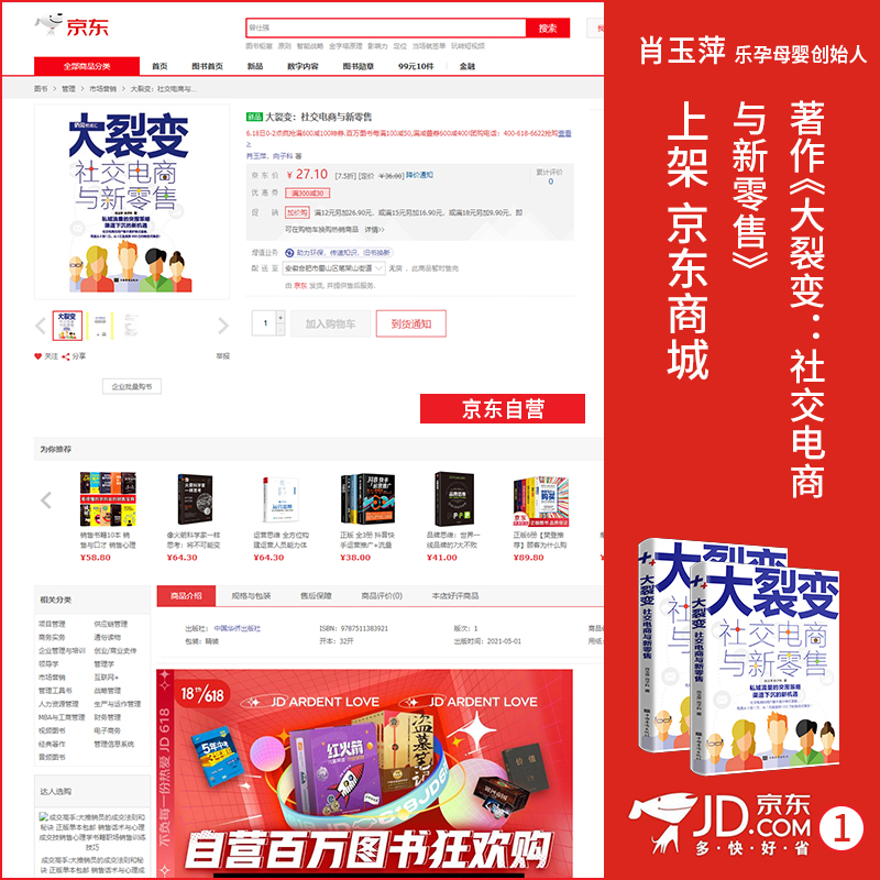 目前,著作《大裂变:社交电商与新零售》正式上架京东等各大图书销售渠道,说明了读者朋友们已经可以通过渠道购买与阅读到这本佳作。大家,也可以通过渠道对著作进行预览和翻阅,从而了解这本图书的总体概况。这更意味着,肖玉萍老师希望可以帮助到广大读者朋友的愿望,又向前靠近了一步。