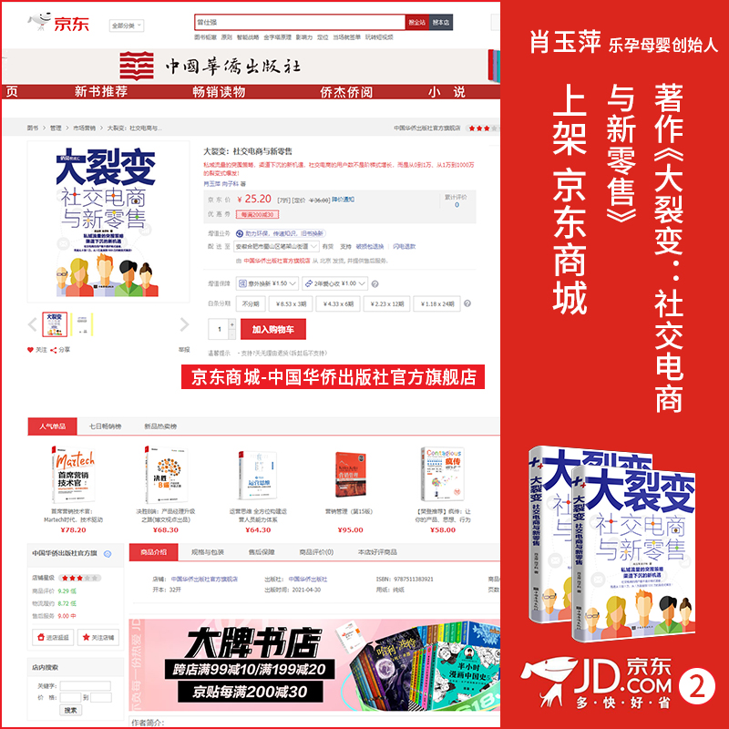 近日,由中国华侨出版社出版、肖玉萍老师与向子科老师共同创作的著作《大裂变:社交电商与新零售》,正式上架京东等各大图书销售渠道。从而,实现了与广大读者朋友见面的愿望。