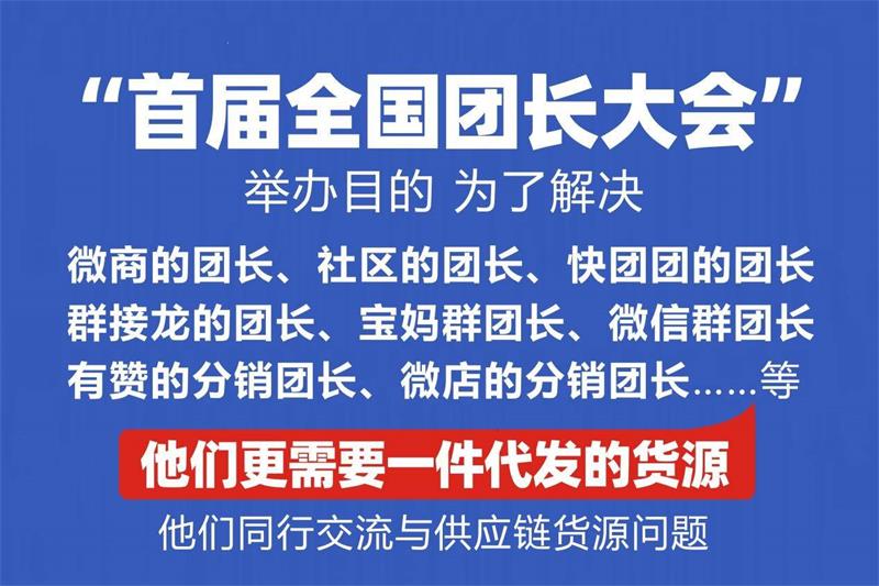 首届全国团长大会参与的团长主要是指:微商的团长、社区的团长、快团团的团长、群接龙的团长、宝妈群的团长、微信群的团长、有赞的分销团长、微店的分销团长等;全国范围组织起来,多层次的交流和对接一件代发的货源。