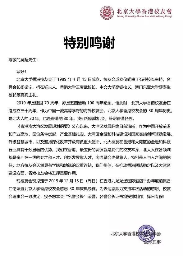 作为中国一流高等学府的海外校友会,北京大学香港校友会的30周年历史是北大人的30年,校友会将借此机会答谢香港各界人士。2019年12月15日(周日),北京大学香港校友会即将在香港九龙龙堡国际酒店举办年度燕集香江论坛暨北京大学香港校友会感恩30年庆典晚宴。为了感谢高盈国际联席董事会主席吴超先生对校友会的鼎力支持,北京大学香港校友会理事会一致决定,授予吴超先生本会“名誉会长”荣誉。