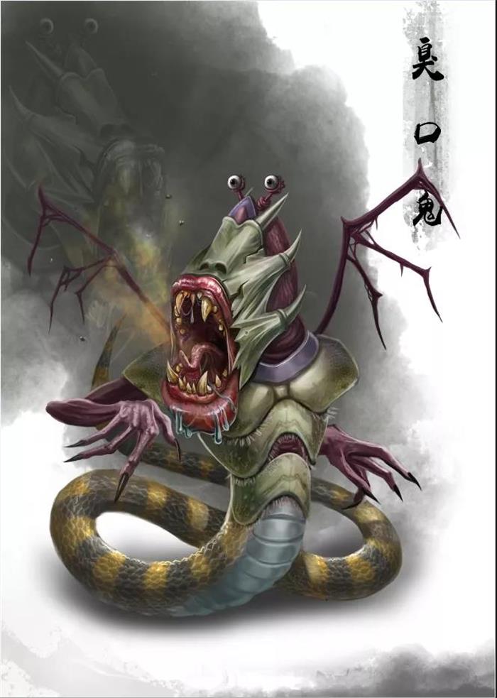 臭口鬼,此鬼口中不断滋生恶臭,气味像粪坑散发的一般。而且这臭气还会熏到它自己,让它呕吐不已。不管他往嘴里塞什么美食,都会迅速腐烂变臭,让它毫无胃口。它也因此而常被饥渴所恼。《佛学大辞典》解释臭口鬼:(异类)九种鬼之一。见饿鬼条。在佛教中,炬口、针口、臭口都属于无财饿鬼。此三者全无食物,常陷饥渴之苦。纵使偶获食物,将食之际,又化作火焰,无法啖食。