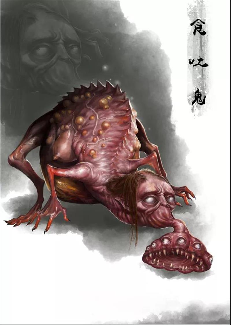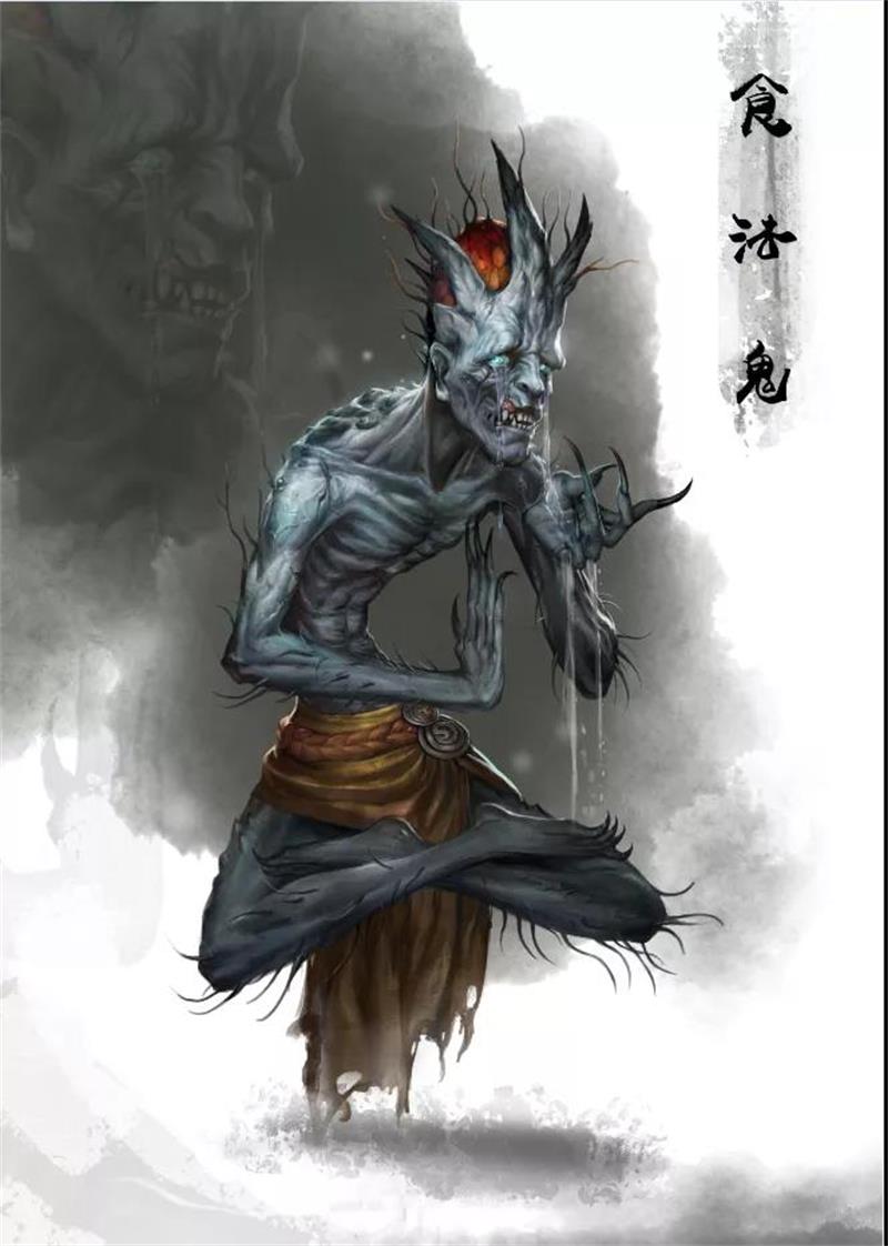 食肉鬼,面貌丑陋不堪,令人心生憎恶,此鬼生前是屠夫,屠杀牲畜并将各种牲畜切割出售,靠缺斤短两赚昧心钱,或挂羊头卖狗肉,以假充真。变成食肉鬼后,专门吃腐烂的动物尸体,然后传染毒菌、祸害生灵。因此对于动物死尸,不可乱抛于垃圾桶或水沟等脏乱之处,以免被此鬼所吃。《正法念处经》所记载三十六鬼之一。