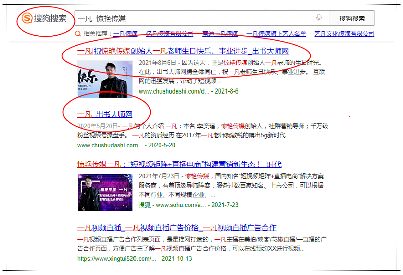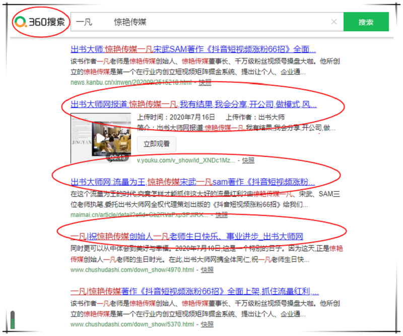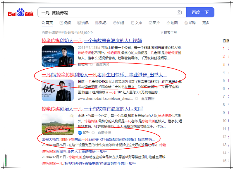 如何传播个人品牌,增强品牌影响力,一凡老师找到了最好的答案。近日,惊艳传媒创始人一凡书作者关键词登顶360、搜狗、百度三大平台,品牌影响力深入人心,行业影响显著提升。现在只要在中文搜索引擎360、搜狗、百度输入“惊艳传媒创始人 一凡”关键词,,即可迅速跳转页面,弹出关于相关一凡老师的诸多相关内容。这充分表示一凡老师的影响力已经达到了高峰状态,从而进一步增强其知名度和影响力,引发社会公众更为广泛的关注,让越来越多的人对一凡老师及其品牌产生好感,吸引众多潜在客户转变为真实客户。