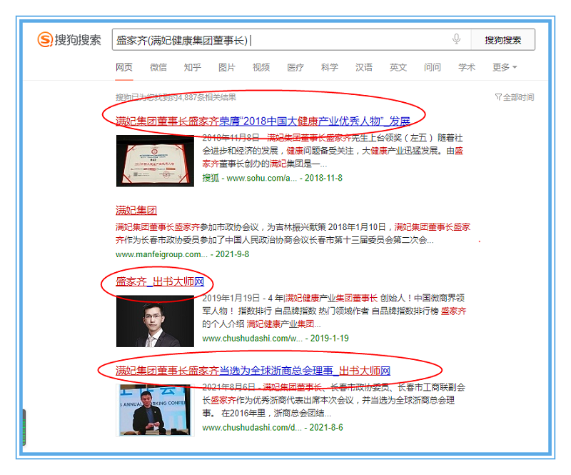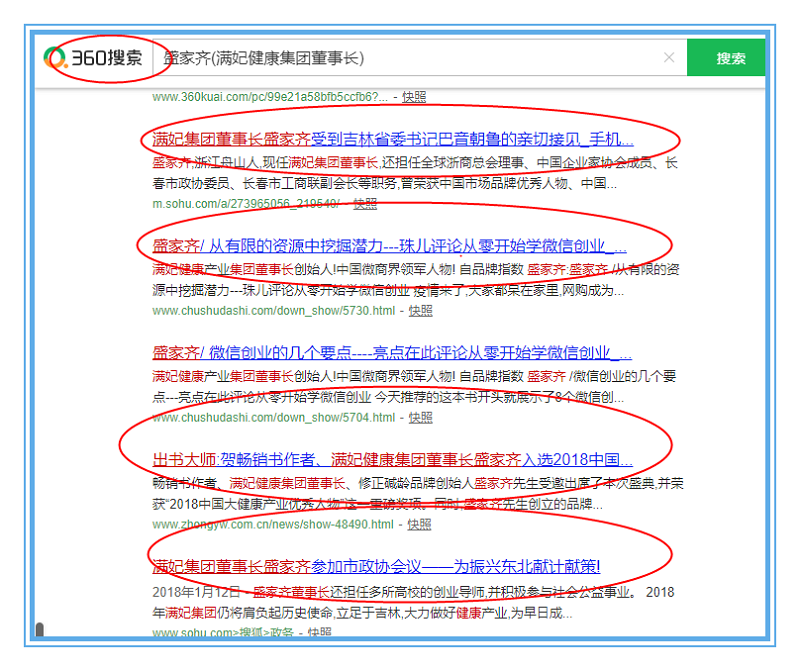 近日,满妃健康集团董事长盛家齐个人品牌网站被360、搜狗、百度三大平台收录。在360、搜狗、百度三大搜索引擎输入“盛家齐”、“满妃健康集团董事长”等关键词后,关于盛家齐老师相关的个人简介、新闻报道以及著作介绍等所有内容,便可迅速查阅到,有效地实现了流量的精准传播。
