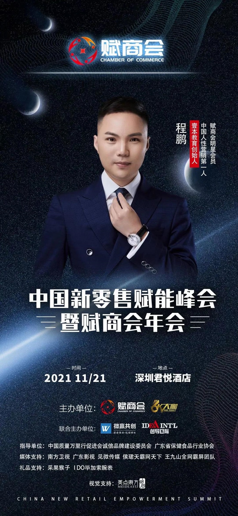 本次盛会由赋商会和大咖主办,联合主办单位为微赢共创和创导国际,中国质量万里行促进会诚信品牌建设委员会、广东省保健食品行业协会作为此次年会的指导单位,主要负责年会的布置、指导和评价。赋商会有多家媒体支持,其中包括南方卫视、广东影视、见微传媒、侯珺天霸网天下和王九山全网霸屏团队,礼品主要由采果猴子和I DO毕加索腕表赞助。