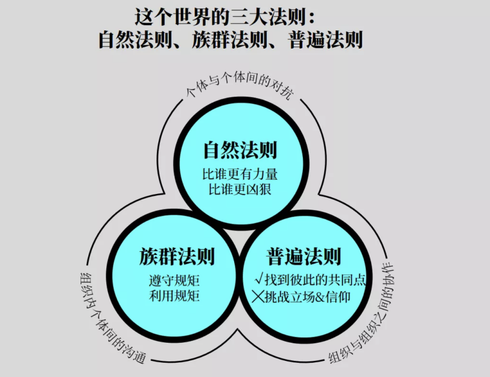 看完这个故事,再看回我们的社会。社会的整体发展,也是按照“自然法则”、“族群法则”、“普遍法则”的顺序不断迭代发展。