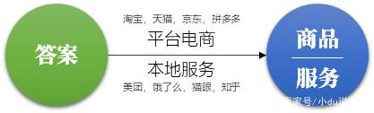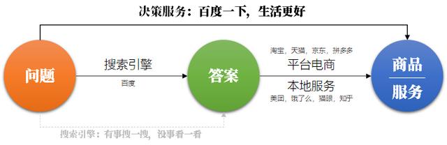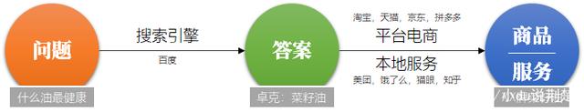 在刚才的案例中,消费者买油的“购买路径”,有两段:1)决策:问题→答案(搜索引擎);2)服务:答案→商品(平台电商、本地服务)。决策在“购买路径”的上游,是百度提供的。服务在下游,是电商提供的。