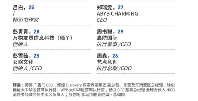 他们虽然年轻,但都或在业内崭露头角,或展现出成为未来行业及社会翘楚的潜在力量,在各自的领域向各种商业及世界级的难题发起一轮又一轮的挑战,相信十年后,他们对中国经济的贡献将远超预期。