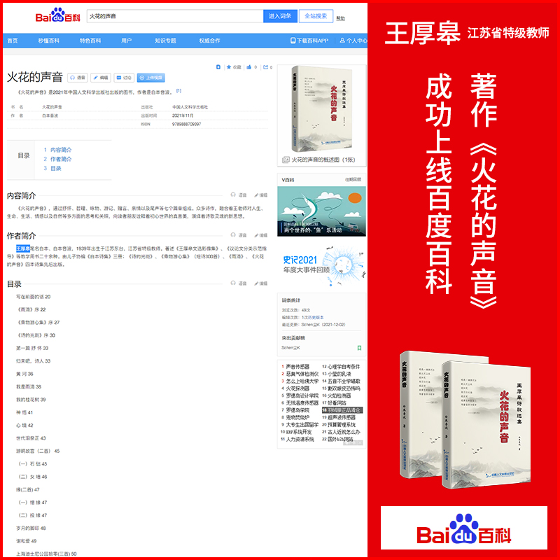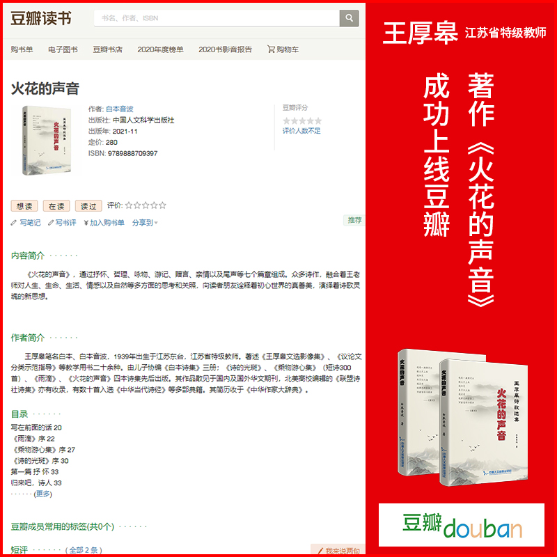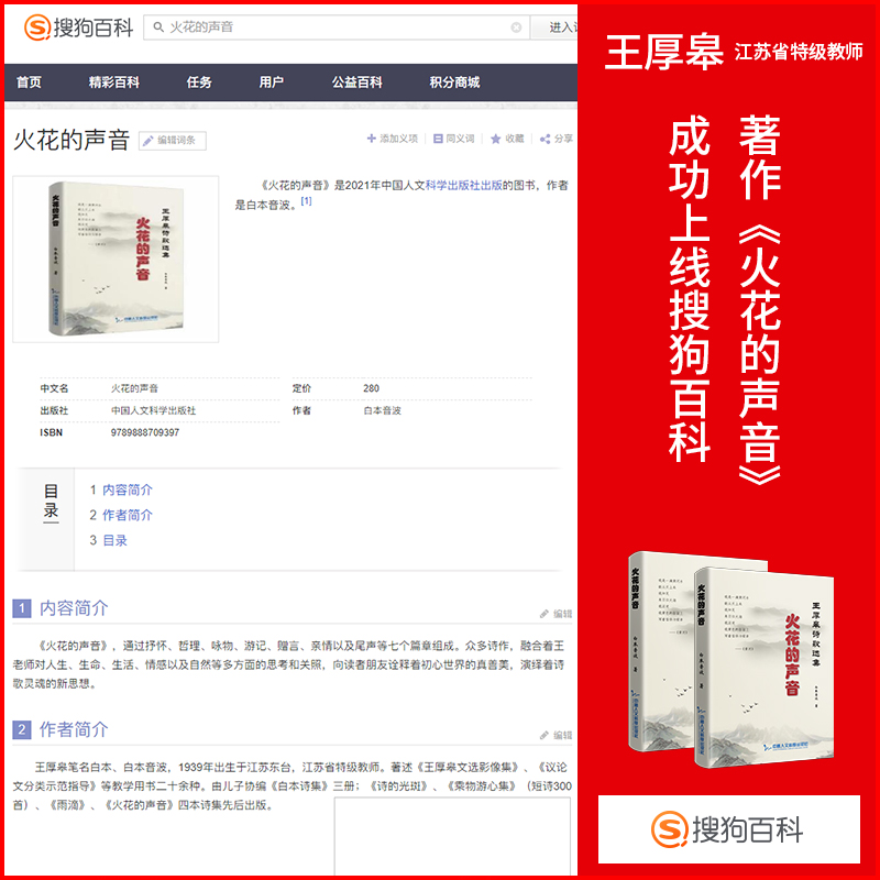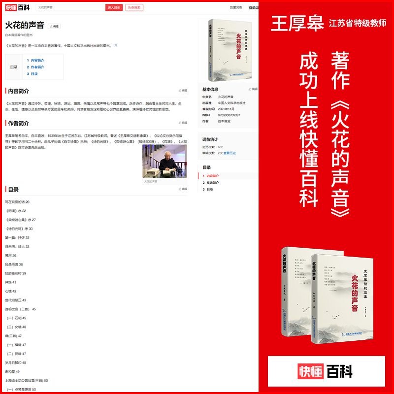 近日,由作家王厚皋老师创作的诗集《火花的声音》成功上线百度百科、搜狗百科、快懂百科以及豆瓣读书等平台,在呈现作品权威价值的同时,也展现出作者个人创作实力的认可。