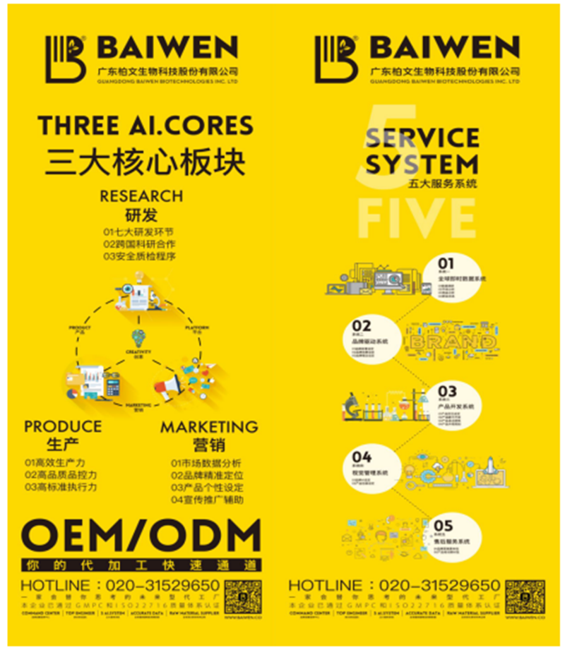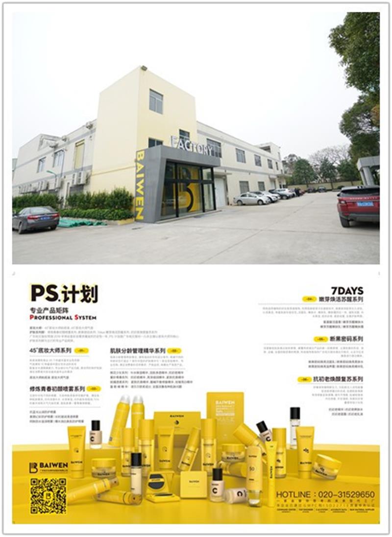 广东柏文生物科技股份有限公司(简称:广东柏文股份),成立于2013年,总部在广州,专注提供专业的代加工与品牌营销服务,旗下主营业务涉及护肤品、化妆品、大健康食品、品牌打造等多个领域。广东柏文股份作为资深的OEM/ODM服务提供商,拥有国际化、专业化、系统化的强大资源,是集专业生产与媒体属性于一身的创新型工厂。公司所有产品均通过世界权威机构检测及国家食品药品监督管理局备案,安全有效,品质可靠有保障。另广东柏文股份有强大的硬件设施与专业的生产人才构成国际级的现代化生产体系,为客户提供高效率、高品质、高标准的OEM/ODM服务。同时,广东柏文股份对产品的质量要求近乎苛刻,每年会投入10%的利润经费到技术科研、产品研发中,旗下优秀的产品研发团队有博士、研究生、本科以上学历的高素质资深工程师,汇集化学、生物科技、皮肤学等多个领域研发人才。分别在食品、护肤品及彩妆的配方调配、基础研究、安全评估、分析检测等专业领域都是出类拔萃的佼佼者,拥有丰富的实战经验和精湛造诣。