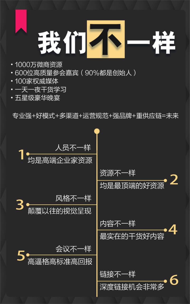 为了让更多的传统企业、实体门店、传统微商、初创业者了解社交新零售最新玩法,掌握重构思维的创新方法,学习行业最权威最顶尖的资讯,这次大会,出席参会的均是高端企业家,分享嘉宾均是行业顶尖实战导师,有着最实在的干货和最成功的案例,我们用最高逼格的准标,回报每位参会者,我们赋能最顶端的资源,让你深度链接。