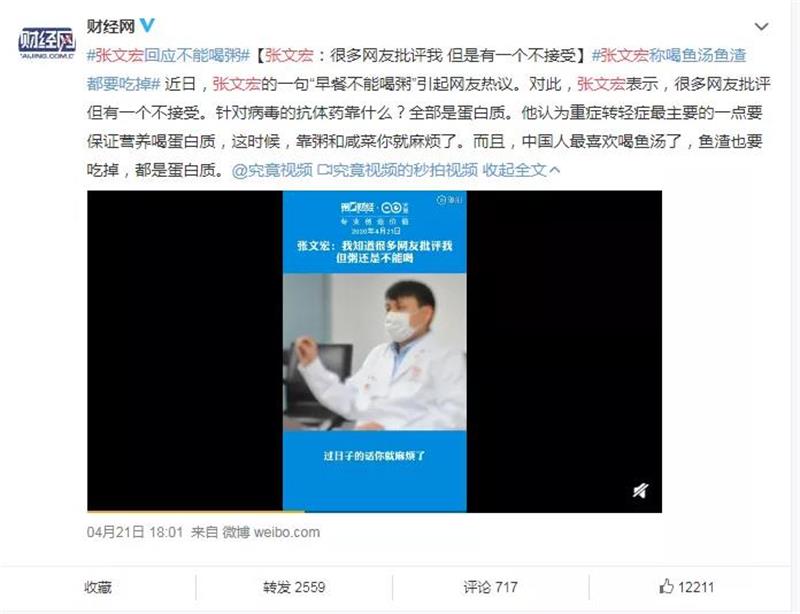 疫情期间,复旦大学附属华山医院感染科主任张文宏在出席一个防控新冠肺炎疫情讲座时表示:“你家里的孩子不管长得胖,长得瘦,喜欢不喜欢吃东西,这段时间他的饮食结构,你要超级重视。绝不要给他吃垃圾食品,一定要吃高营养、高蛋白的东西。每天早上准备充足的牛奶,充足的鸡蛋,吃了再去上学,早上不许吃粥。”该言论一出,便在网上激起了千层浪。