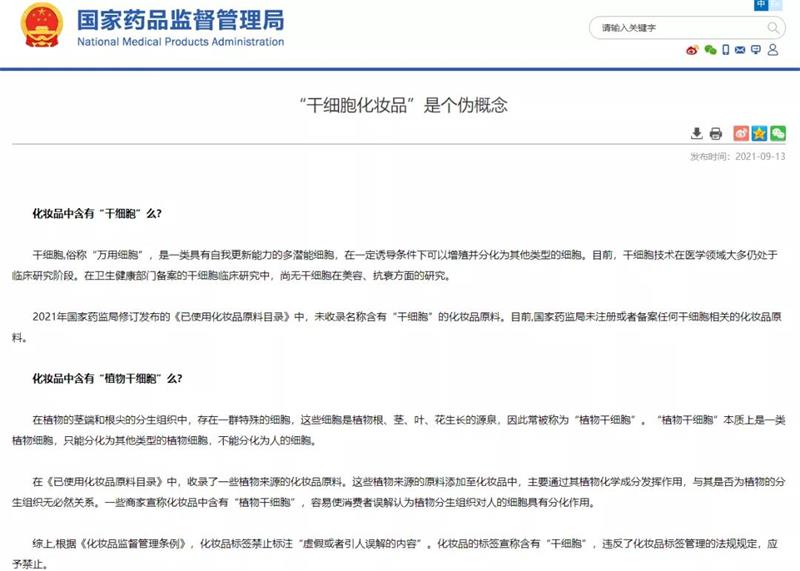 2021年国家药监局修订发布的《已使用化妆品原料目录》中,未收录名称含有“干细胞”的化妆品原料。目前,国家药监局未注册或者备案任何干细胞相关的化妆品原料。
