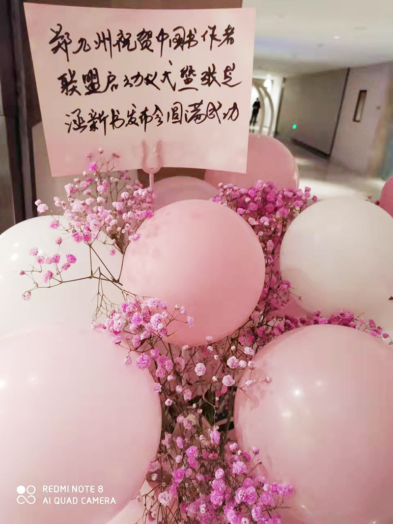 本次活动,赋商会创始人郑九州老师,以特邀嘉宾的特殊方式参与到了其中。他为大家,送去了一个特别有意义的花篮。整个花篮当中,簇拥着许多粉紫色的鲜花,并且搭配着不少粉色的气球。而在花篮的顶部,则是他为活动送去的真心真意。那,是一张满载祝愿的卡片。上面写着:“郑九州老师祝中国书作者联盟启动仪式暨张芝涵新书发布会圆满成功。”