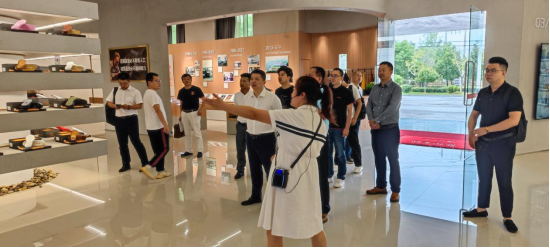 在孺子牛鞋业集团的专人带领下,天淘一行人参观了孺子牛鞋业的发展历史、专利技术、现有的产品与产品线。在专人的介绍下,天淘集团一行人了解到公司现有员工近2000人,占地面积18万平方米,总资产4.8亿元,主要生产的产品是户外休闲鞋、各类鞋底、鞋材和拖凉鞋,共分10大系列200个品种2500多个规格型号。公司年产量达6000多万双,在全国设有116个销售处、3000多个零售终端,遍布33个省、市、自治区,企业多次被评为“AAA信用”企业、“重合同守信用”企业。并且随着时代的发展,孺子牛鞋业集团也在进行线上化转型、数字化开拓,争取为企业的发展打开更宽的渠道,至今已经拥有2家旗舰店且拥有数十万的销量。
