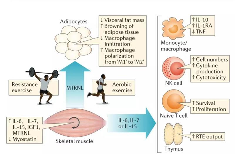 除了IL-6,骨骼肌还将分泌IL-7、IL-15等细胞因子刺激免疫细胞T细胞的激活、NK细胞的产生以及抑制脂肪产生。不仅如此,定期的运动也会降低病毒感染,增加肠道内微生物群的多样性。
