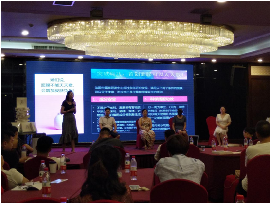社交赋能新零售,领军品牌创未来。此次会议独家冠名赞助的卡露泉品牌是一款具有十几年品牌沉淀的面膜,它结合社交新零售转型升级,重新布局线下城市生活馆,以消费者为中心,跨界整合现有资源,相互引流,共享资源。卡露泉品牌cola讲师分享:卡露泉7天焕颜面膜是法国卡露泉研究中心(香港)有限公司推出的新概念面膜,7天面膜打破常规,颠覆传统敷面膜观念,根据人体肌肤大小周期首创“7天循环面膜护肤法”,通过科学搭配,让肌肤在一周内以基础护理到特殊护理的组合,从清洁、保湿、透亮、紧致四个层面,给予肌肤持续、渐进式呵护。
