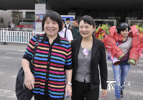 著名作家毕淑敏(左)飞抵乌鲁木齐国际机场
