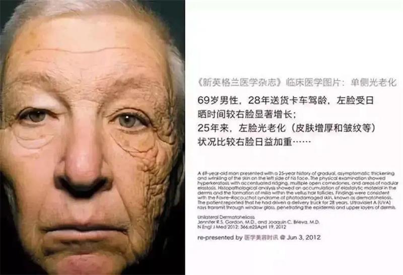 皮肤老化过程中,光老化是引起皮肤老化最重要的原因。阳光直晒不但会让人变黑,还会加速皮肤水分流失和皮肤老化,加重雀斑,还可能滋生皱纹。