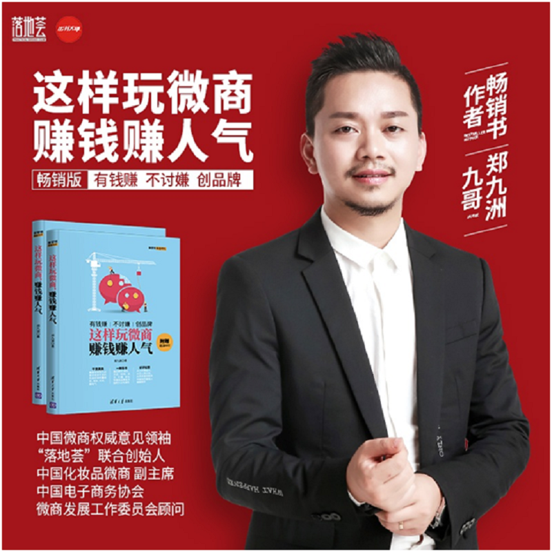 九哥(郑九洲),中国著名微商“落地荟”(专注微商服务)联合创始人,现任中国电子商务协会微商发展工作委员会顾问、中国工商联美容化妆品商会、微店商专业委员会荣誉会长、中国微商学院微商运营师双证书全国考核项目客座院长、荣获“中国3.15诚信微商微商导师”、“2016中国微商十大最具影响力人物”、“2017中国微商十大意见领袖”同时被认命中国化妆品微商副主席!