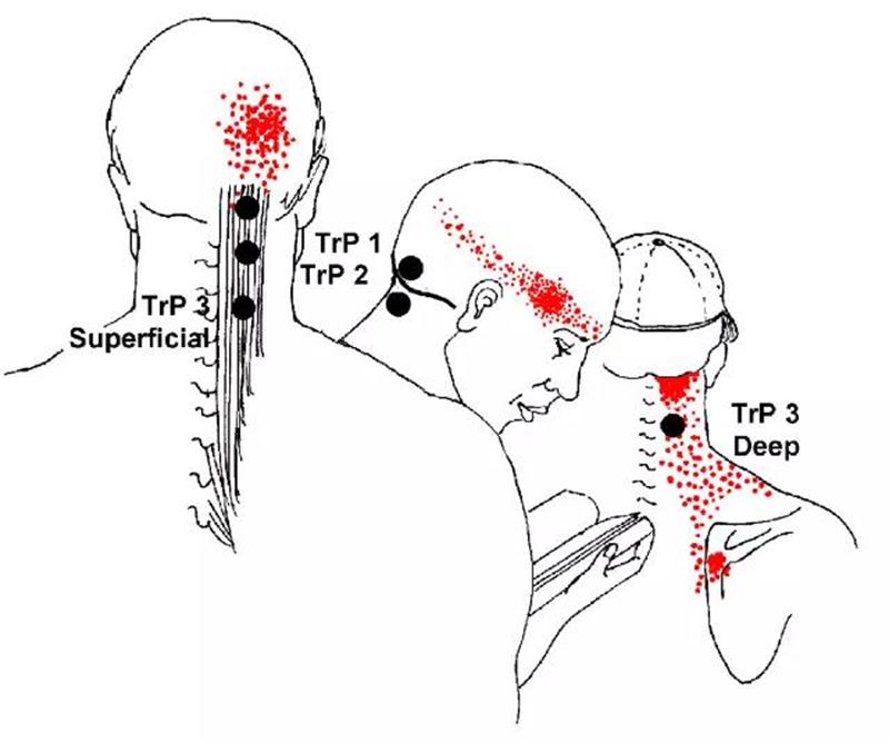 当头半棘肌内有激痛点,疼痛会围绕整个头部,最痛点的部位在太阳穴和眼睛上方额头部位。