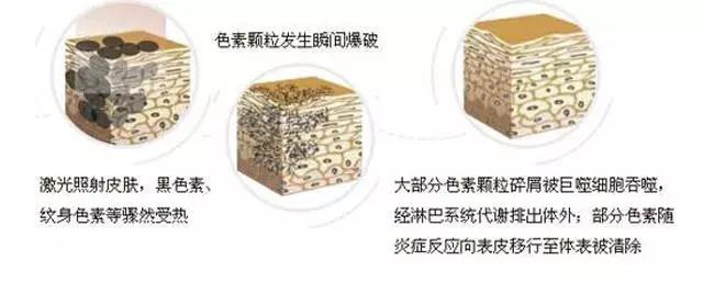 最常用的就是Q开关激光,这种激光器发射的特定波长的激光束峰值功率非常高,被色素吸收后,色素在光热效应下被粉碎,色素团块被迅速膨胀、破碎,随后这些小碎片逐渐被体内的吞噬细胞吞噬,清除出体外,另外由于释放能量的时间极短,短到时间为几十纳秒,使其产生的热量不传输到周围组织和表皮,不造成正常皮肤的损害,治疗后原则上不形成疤痕。