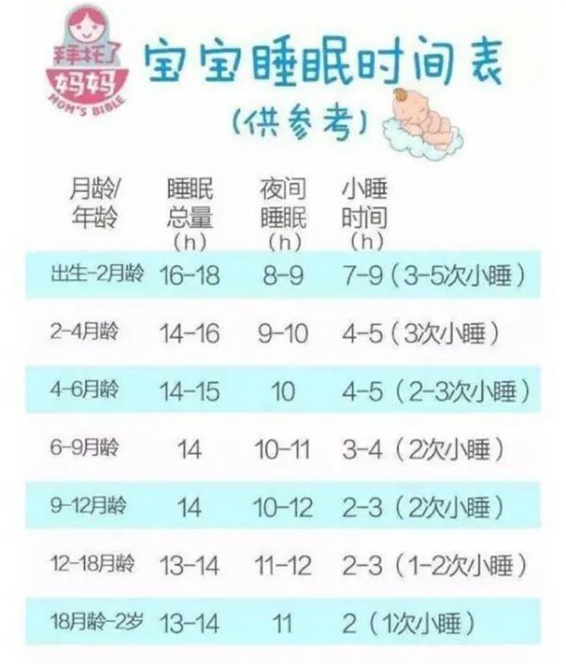 可以参考以下表格,如果有较大差异也不要太过担心,应对孩子的睡眠规律做好把握,当有黑眼圈、扯耳朵、揉眼睛、困倦情况发生时,说明要让孩子睡觉了。