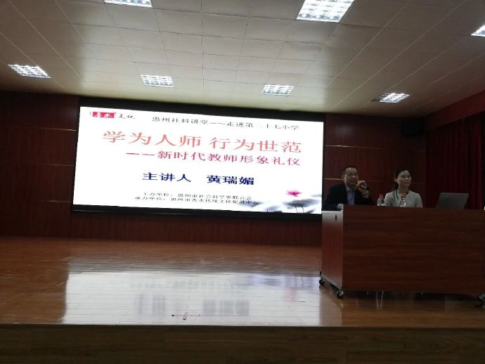 202018日上午九点半由惠州市社会科学界联合会主办,惠州市第二十七小学协办,善水文化承办的 《学为人师 行为世范 ——新时代教师形象礼仪》专题讲座在惠州市第二十七小学举行。