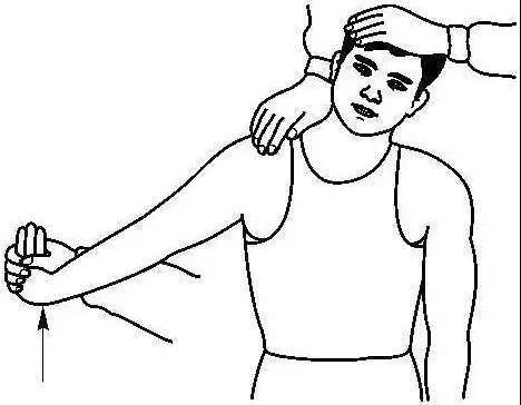 患者取坐位,头偏向健侧,检查者一手抵患侧头部,一手握患腕,向相反方向牵拉。