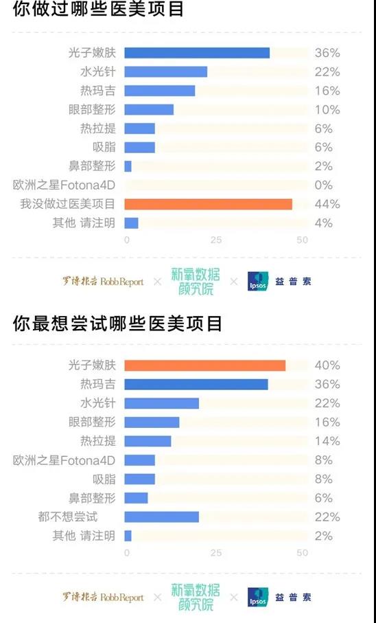 具体到医美消费需求,受访者更青睐轻医美,光子嫩肤、热玛吉最受青睐,在高净值人群消费意愿排行中居第一、二位,分别占比高达40%、36%。
