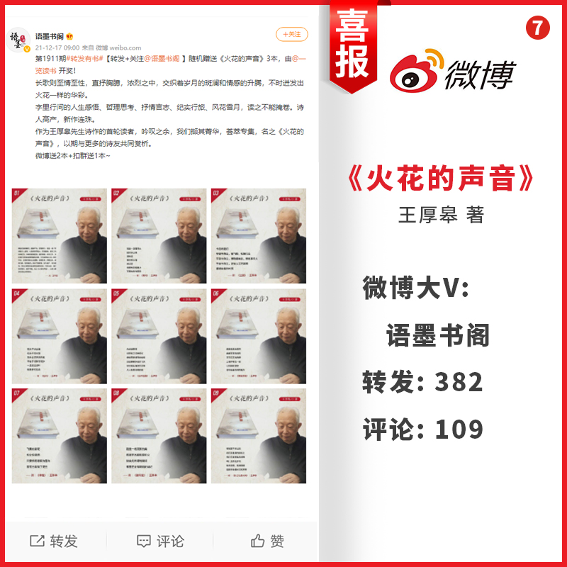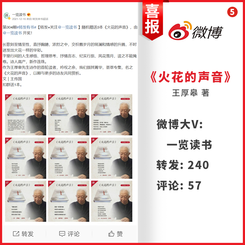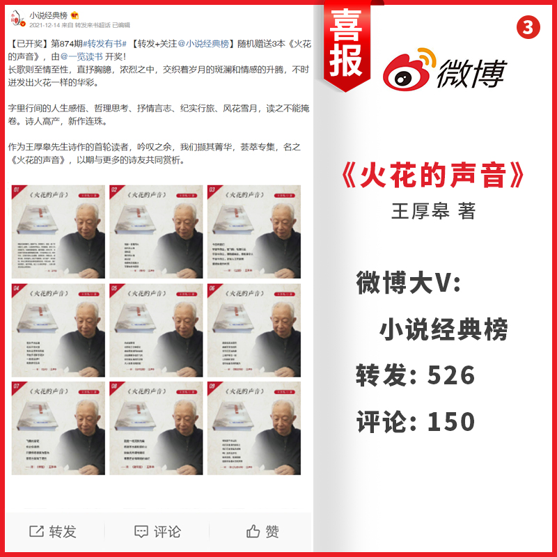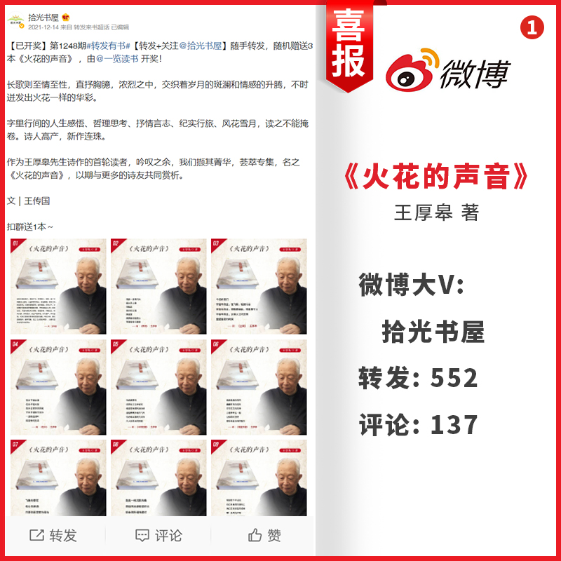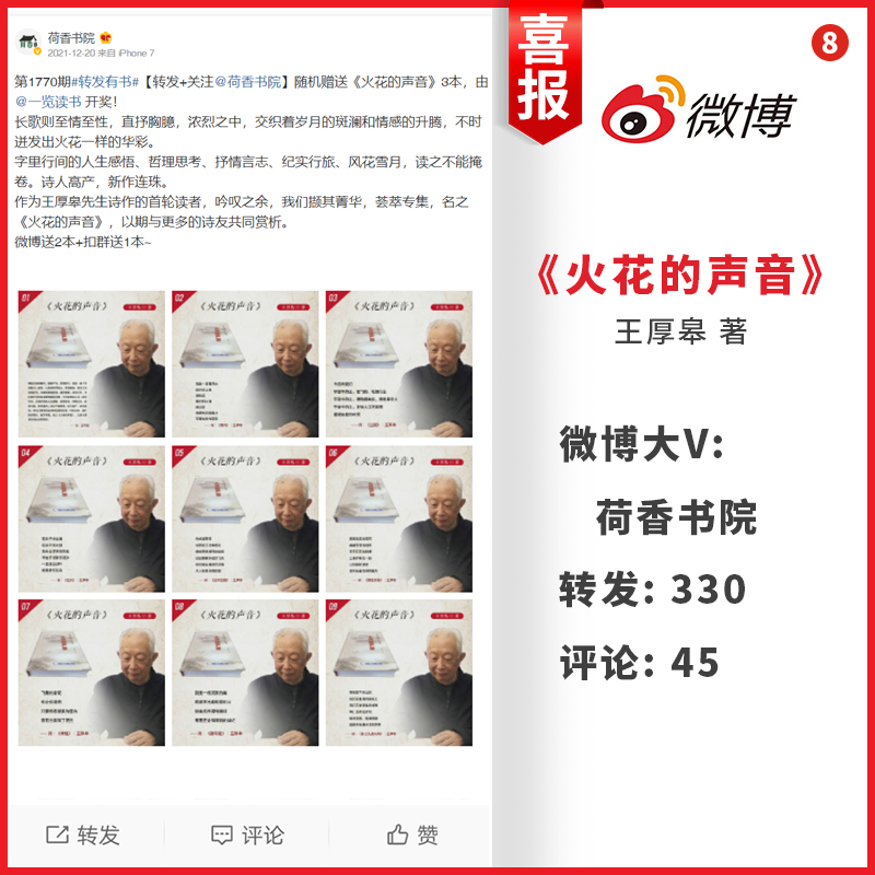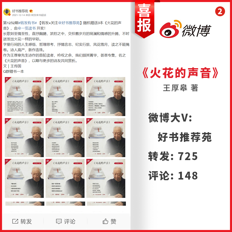 最近,王老师的诗集《火花的声音》,获得众多微博大V的极力推荐,在展示他诗歌创作实力的同时,也呈现了该诗集的文学魅力。在拾光书屋、好书推荐苑、小说经典榜、枫枫LAM、一览读书、阅读风尚、语墨书阁以及荷香书院等微博大V的推荐下,《火花的声音》共获得了约3310次转发与约737次评论。所有书友的转发与评论,几乎都属好评。由此,掀起了一股好评的热潮。