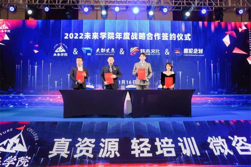当晚也进行了庄重的2022年度战略合作签约仪式,大都友良国际会展公司、炫木文化和嘉伦企业文化策划分别与未来学院签约,约定2022年度长期合作绑定。