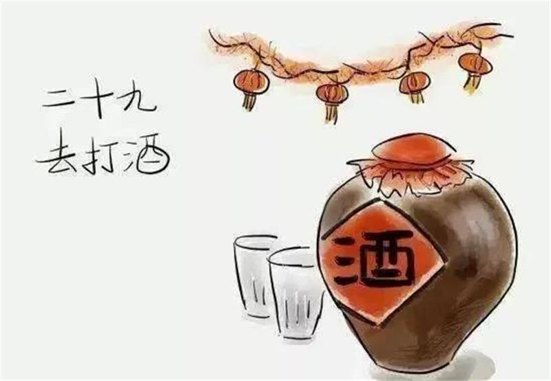 腊月二十九,称作“二十九去打酒”。中国人还会准备些酒。可以看到是“打酒”,不是“买酒”。因为在旧时代,人们买不起瓶装酒。他们用自己的瓶子或塑料袋去酒家买酒,酒会放在一个大容器里。