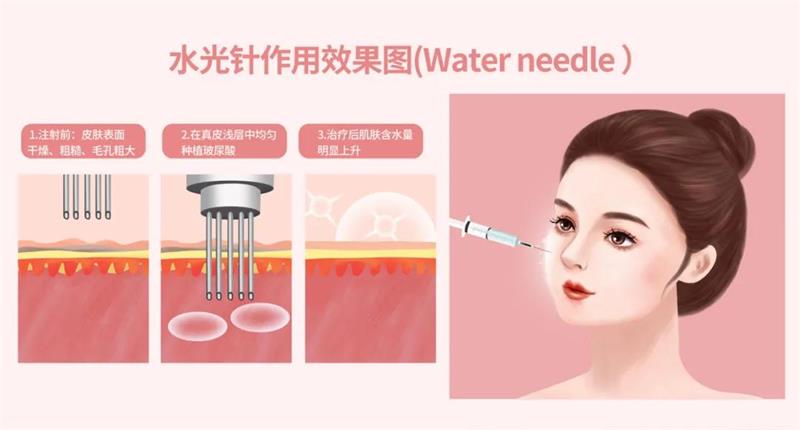 水光针就是一种将以透明质酸为主要成分的溶液注射至面部真皮浅层以改善皮肤状态的疗法,主要功效是补水、锁水。