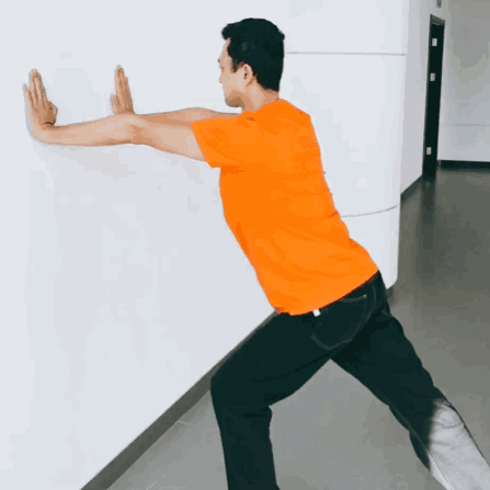 上身挺直,双手前伸扶住墙壁;两腿一前一后,前腿弯曲,后腿伸直,脚跟着地。